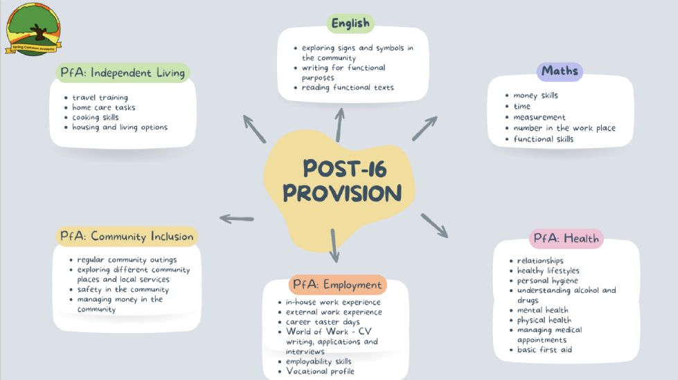 Throughout their time in Post-16, students and parents/carers are well supported to explore different options for life after Post-16 provision. Post-16 at Spring Common is a 3 year provision but some students may feel ready to move on after their first or second year. In particular, students working at Entry Level 3 in Year 11 will be supported to explore appropriate options including college. This will be discussed annually at EHCP annual reviews, parent’s evenings and at moving on events. Please see our ‘Moving On’ page for more details.